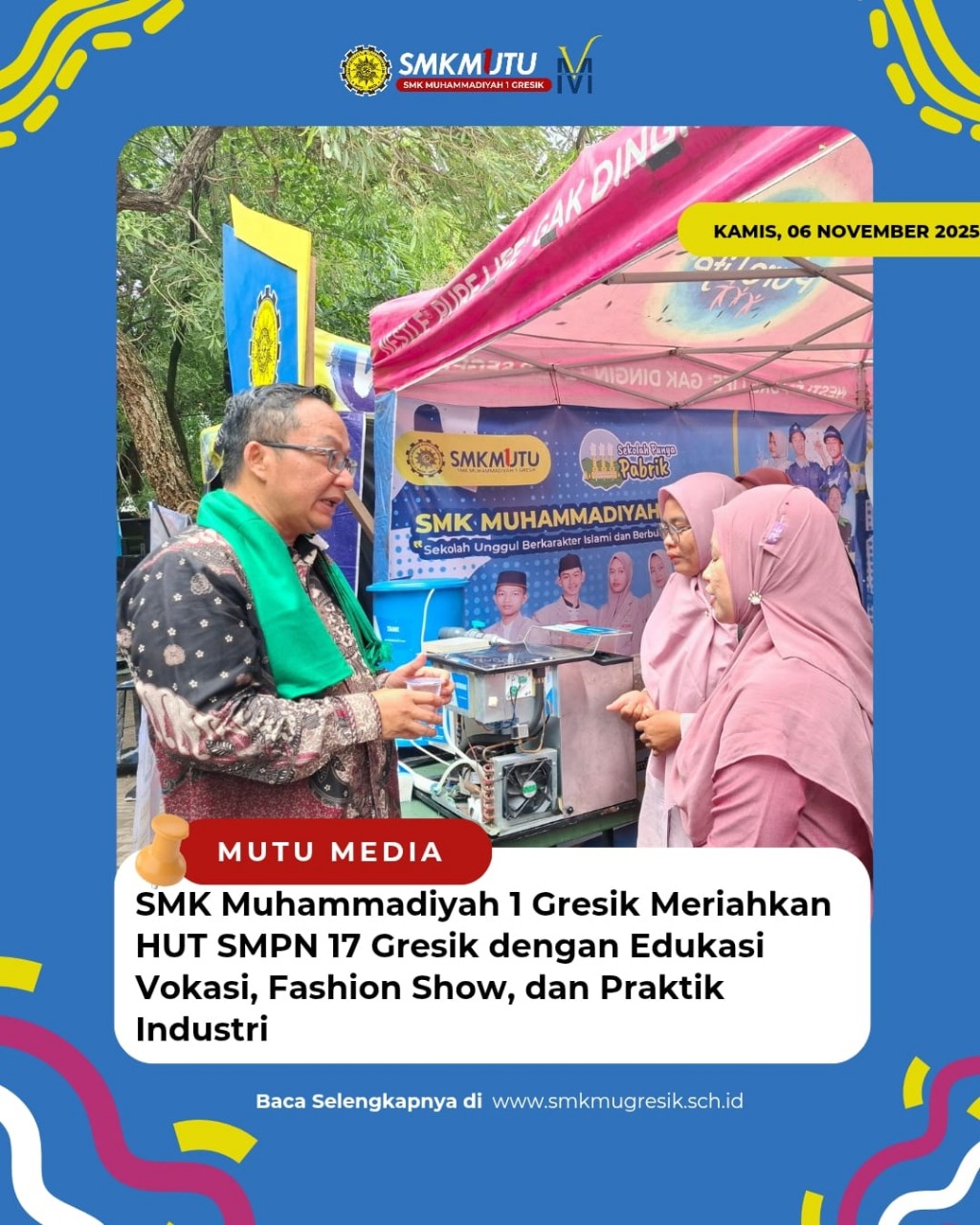 Gresik, 7 November 2025 — SMK Muhammadiyah 1 Gresik turut memeriahkan HUT SMPN 17 Gresik dengan menghadirkan konsep promosi vokasi yang kreatif dan interaktif. Melalui Fashion Show Edukatif yang diiringi narasi pengenalan program keahlian, boarding school, serta program unggulan sekolah, SMK Mutu berhasil menarik perhatian siswa dan wali murid yang hadir dengan tampilan vokasi yang modern, percaya diri, dan inovatif.