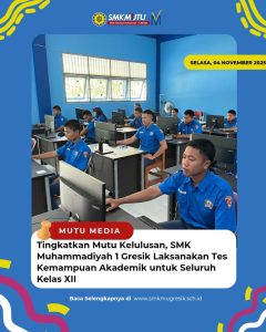Gresik — SMK Muhammadiyah 1 Gresik melaksanakan Tes Kemampuan Akademik (TKA) bagi seluruh siswa kelas XII semua konsentrasi keahlian. TKA dilaksanakan dalam dua gelombang. Gelombang pertama diikuti oleh siswa dari jurusan Akuntansi (AKT), Teknik Pemanasan dan Pendinginan Udara (TPTU), serta Teknik Kendaraan Ringan (TKR). Kegiatan ini berlangsung selama dua hari, mulai Senin hingga Selasa, 4–5 November 2025, dengan tujuan mengukur kemampuan akademik siswa sebagai bagian dari evaluasi kelulusan dan persiapan menghadapi dunia pasca-sekolah. TKA mencakup kompetensi akademik umum di antaranya yaitu Matematika, Bahasa Indonesia, dan Bahasa Inggris, serta materi sesuai peminatan masing-masing jurusan. Dengan pelaksanaan ini, sekolah berharap lulusan SMK Muhammadiyah 1 Gresik memiliki kesiapan tidak hanya dalam keterampilan vokasi, tetapi juga kemampuan akademik yang mumpuni untuk bersaing di dunia kerja maupun pendidikan lanjutan.